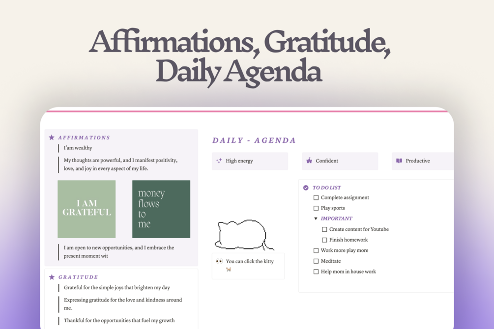 ✦ Affirmations & Gratitude Oasis β†’ Nurture a positive mindset with a dedicated space for daily affirmations and gratitude expressions.